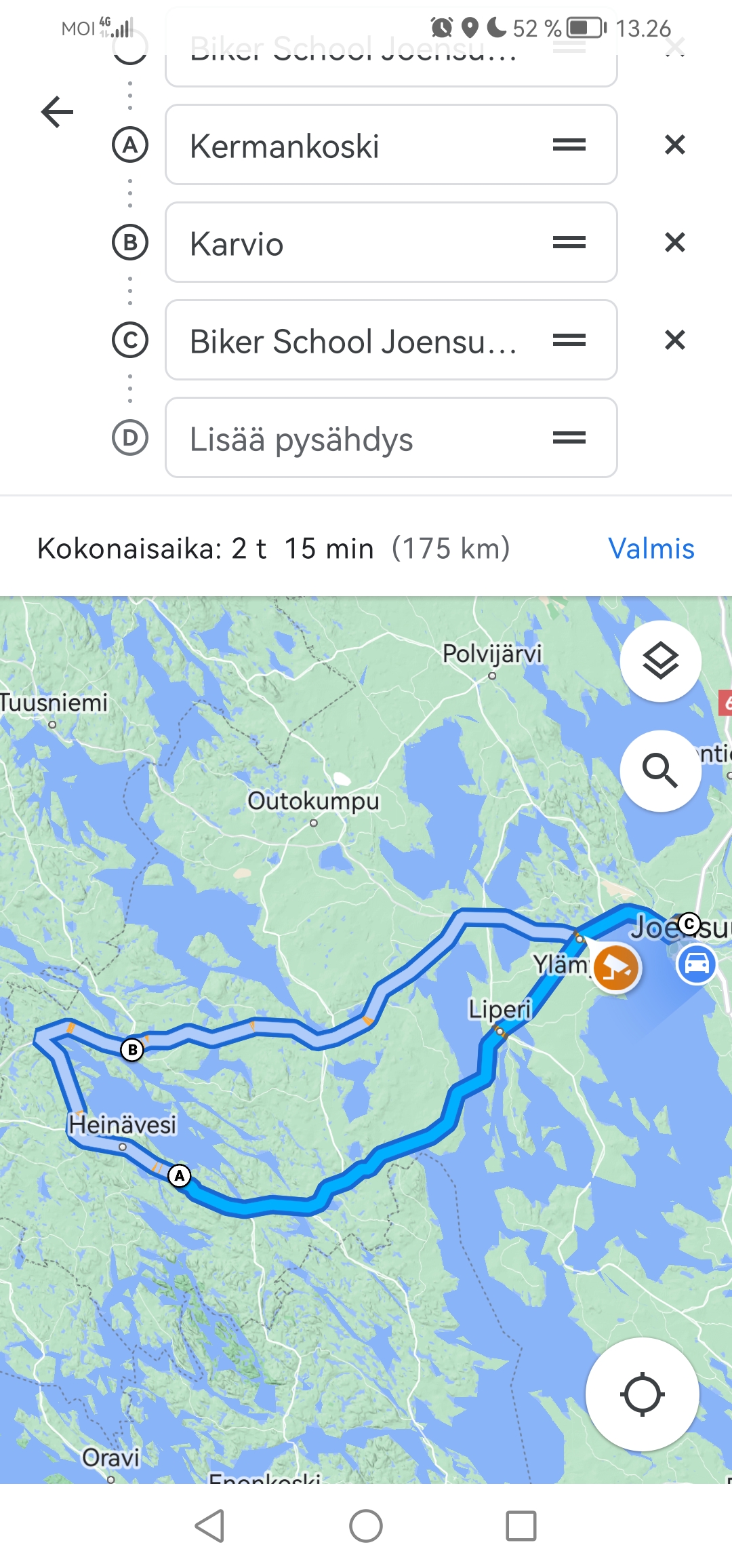Lähtö Biker schoolin pihasta klo 11. Reittinä Ylämylly-Liperi-Kermankoski-Karvio.