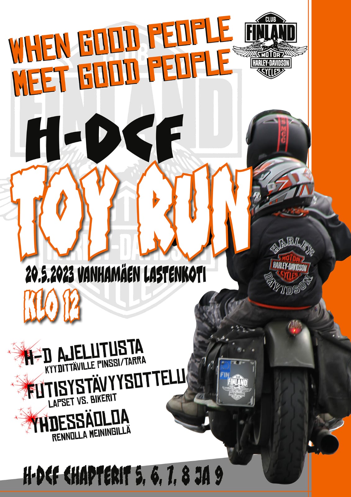 Perinteinen H-DCF Chaptereiden 5, 6, 7, 8 ja 9 Toy Run eli Leluralli järjestetään lauantaina 20.5.2023 Suonenjoella. Kohde Vanhamäen lastenkoti (osoite: Vanhamäentie 122 b, 77600 Suonenjoki).