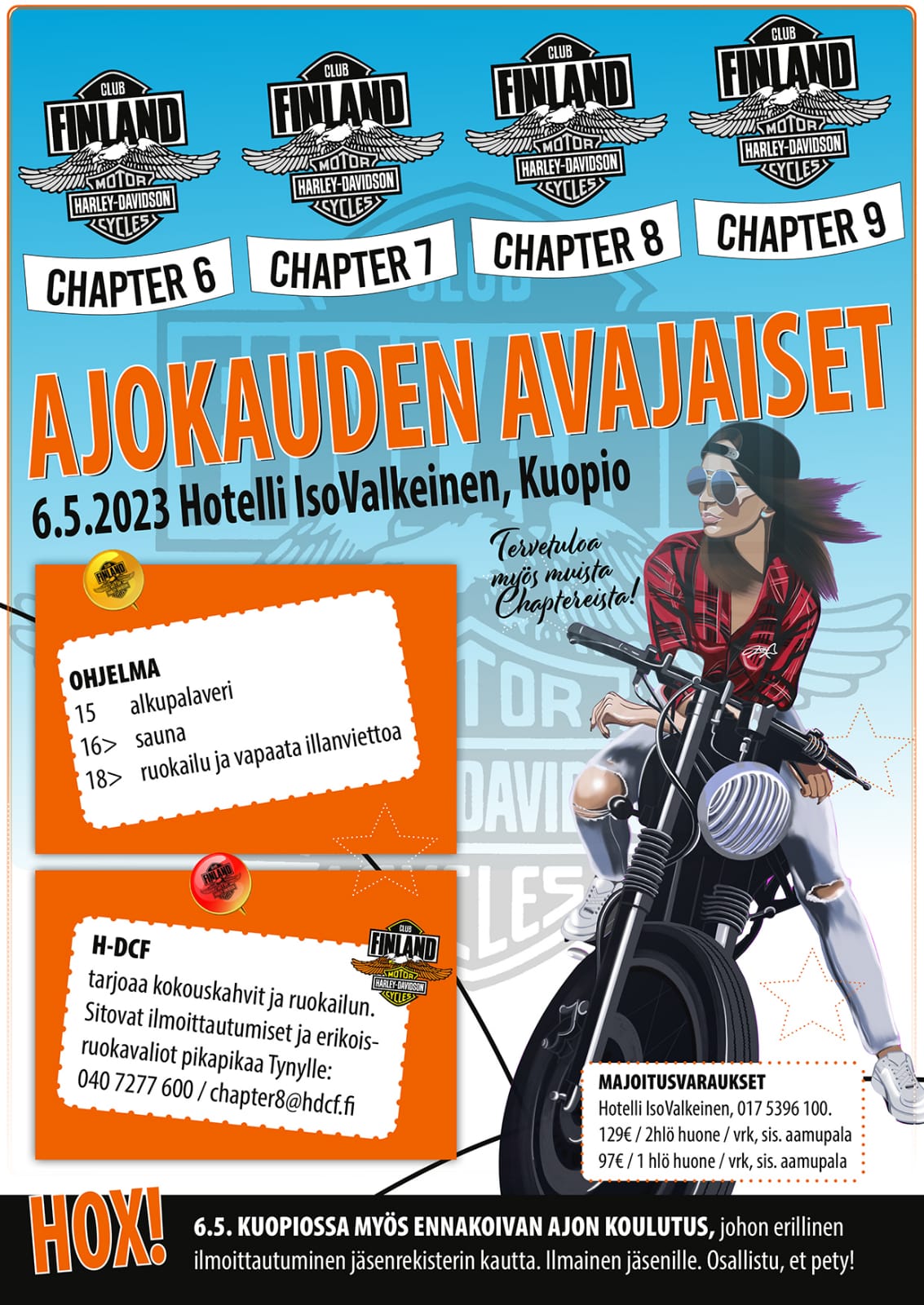 Sitovat ilmoittautumiset Ajokauden avaukseen ja erikoisruokavaliot viimeistään 17.04.2023 Tynylle numeroon 0407277600/chapter8@hdcf.fi
